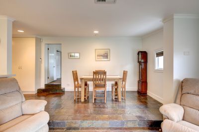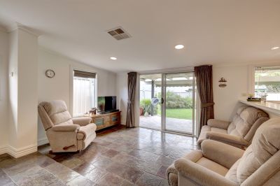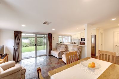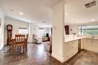 Adjoining the kitchen is the spacious family room with slate flooring, incorporating a casual meals area, with glass sliding door providing access to the full length rear paved veranda space, overlooking the landscaped garden. The ideal space for the outdoor setting and summer BBQ’s