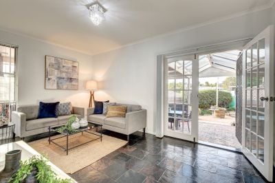 The Family / Dining is further complimented with dual French glass and timber doors, overlooking as well as providing access to an expansive outdoor, paved entertaining area, with extensive covered pergola, designed with seamless integration to match the interior design of the house, encouraging you to experience the rich outdoor lifestyle provided by this home, with its lovely lawn area and landscaped surrounds.