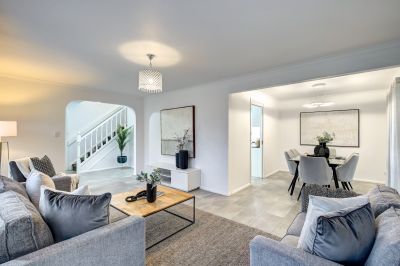 Attributes include tiled entrance hall leading to elegant Formal lounge dining with large picture windows taking in views over the front garden
